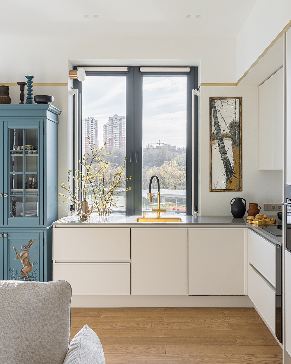 Передо дизайнером Анной Исуповой встала задача найти компромисс между архитектурой современного ЖК, ритмами большого города и привычкой заказчиков жить за городом неспешной и размеренной жизнью, их любовью к малой родине. Поэтому основа проекта стала лаконичной и современной подстать локации и видам из окон. И в эту канву умело вплели историю о любви к природе, традициям, искусству, семейные ценности и рассказы о путешествиях.